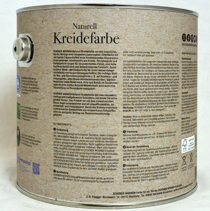 Innenfarbe, die die Vorzüge einer besonders pudermatten Oberfläche mit den besten Eigenschaften einer hochdeckenden Dispersionsfarbe verbindet. Inhaltsstoffe wie Kreide, Porzellanerde und Farbpigmente sorgen für ein pudermattes Finish, eine hohe Farbtonstabilität und eine beeindruckende Farbtiefe. Dabei ist diese Wand- und Deckenfarbe für innen wasserdampfdurchlässig und konservierungsmittelfrei. Die richtige Wahl für Neu- und Renovierungsanstriche z. B. auf Raufaser- und Prägetapeten, alten Dispersionsfarbenanstrichen, Gipskartonplatten sowie Mauerwerk, Putz und Beton. Im Zusammenspiel mit dem matten Naturell Möbelschutz wird auch eine Verarbeitung auf Holzmöbeln ermöglicht.