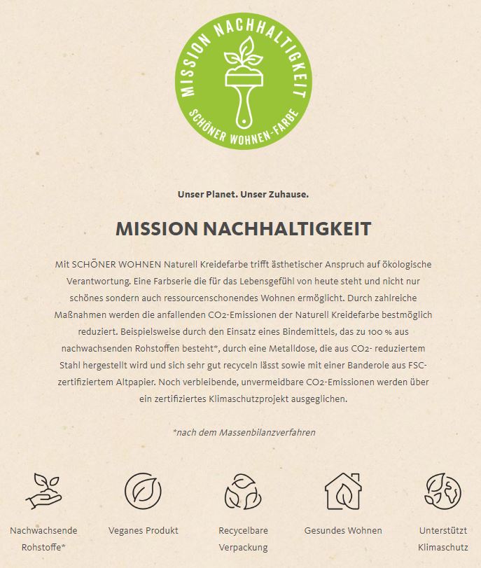 Schaffen Sie eine natürliche Balance in Ihrem Zuhause. Dies gelingt Ihnen mit der Naturell Kreidefarbe besonders gut. Die vegane Rezeptur enthält hochwertige Pigmente sowie ein Bindemittel, das zu 100 % aus nachwachsenden Rohstoffen besteht. Bei der sorgfältigen Herstellung entstandene CO²-Emissionen werden kompensiert und die nachhaltige Verpackung lässt sich sehr gut recyceln.