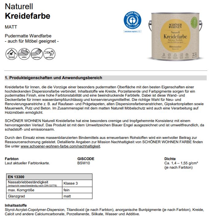 Innenfarbe, die die Vorzüge einer besonders pudermatten Oberfläche mit den besten Eigenschaften einer hochdeckenden Dispersionsfarbe verbindet. Inhaltsstoffe wie Kreide, Porzellanerde und Farbpigmente sorgen für ein pudermattes Finish, eine hohe Farbtonstabilität und eine beeindruckende Farbtiefe. Dabei ist diese Wand- und Deckenfarbe für innen wasserdampfdurchlässig und konservierungsmittelfrei. Die richtige Wahl für Neu- und Renovierungsanstriche z. B. auf Raufaser- und Prägetapeten, alten Dispersionsfarbenanstrichen, Gipskartonplatten sowie Mauerwerk, Putz und Beton. Im Zusammenspiel mit dem matten Naturell Möbelschutz wird auch eine Verarbeitung auf Holzmöbeln ermöglicht.