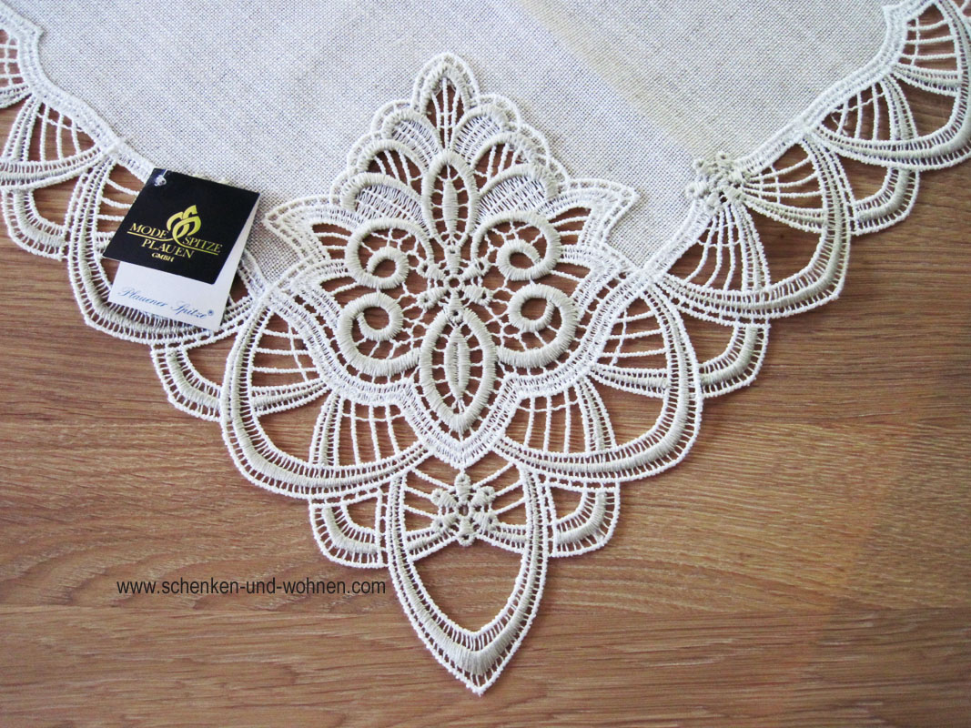Eine feine Stickereispitze konfektioniert mit hochwertigen, pflegeleichten Stoffen zeichnet dieses Deckchen aus.